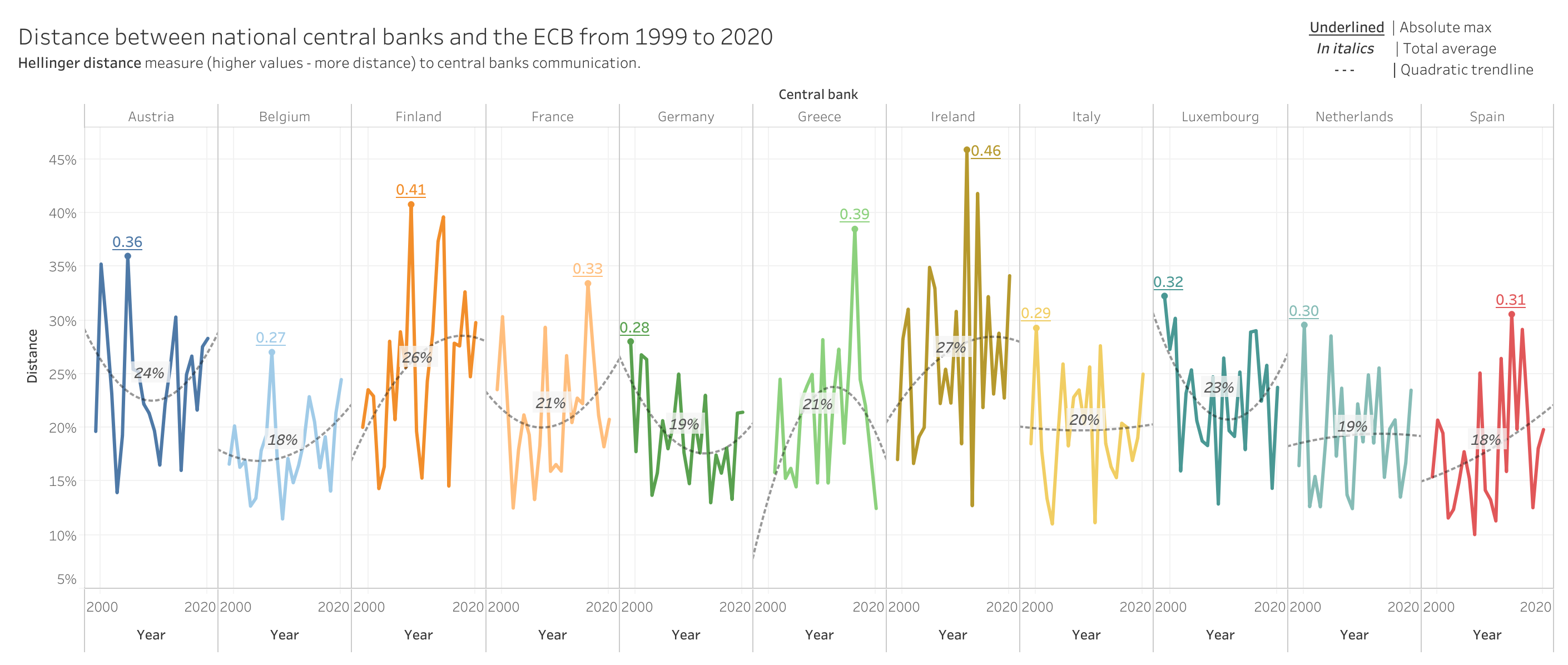 In Tableau, I visualize topics’ evolution over years. The visualization allows to compare the use of topics by each CB with the annual average of all CBs (upper chart). As well, I show how the attention to each topic changes for every CB (lower chart).